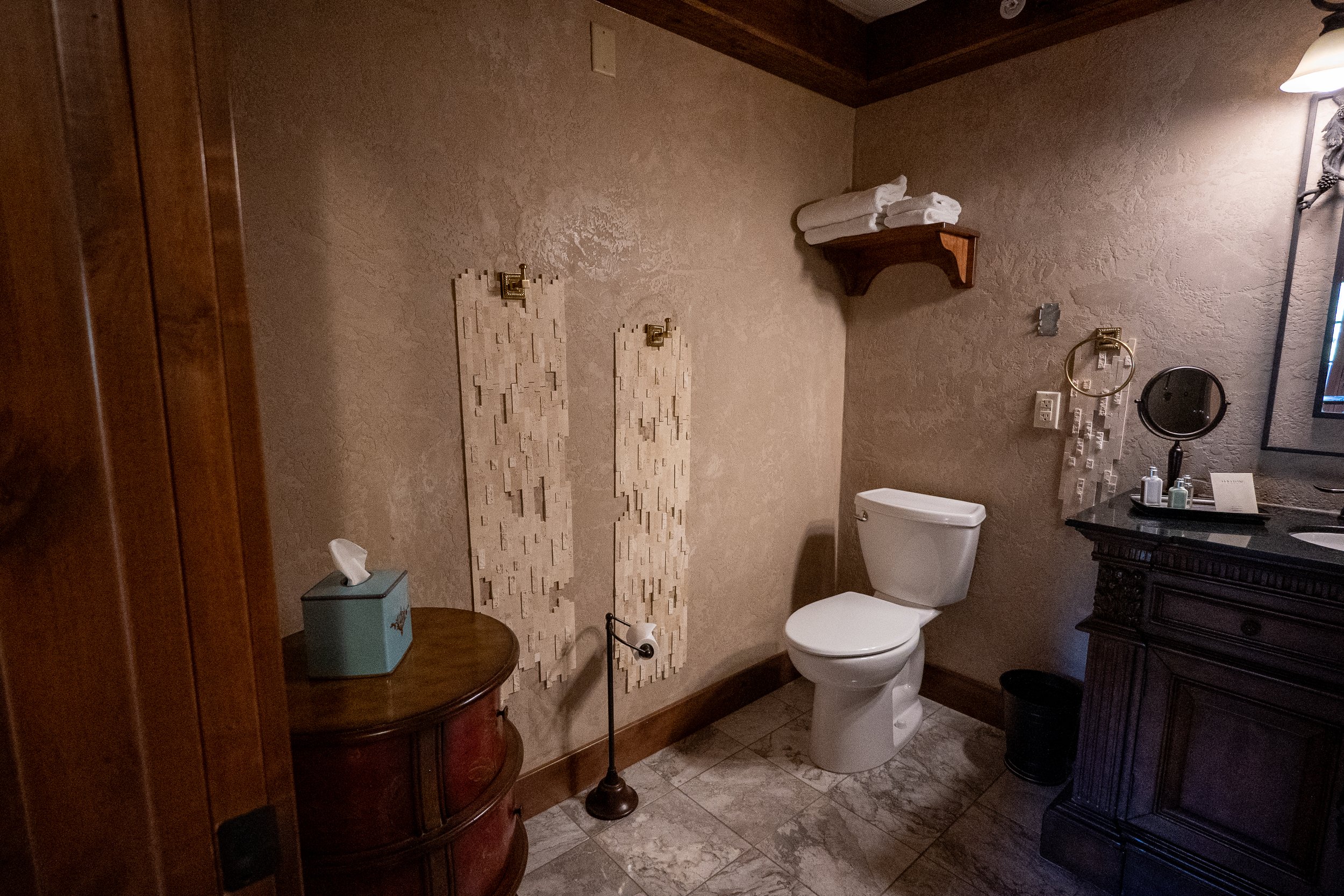 A hotel bathroom with a white toilet, dark wooden vanity, decorative wall art, and a shelf with folded towels.