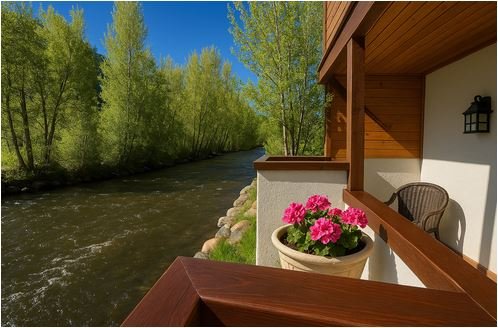 A riverside balcony with a flower pot containing pink flowers, a chair, and a lantern, overlooking a flowing river and green trees under a clear blue sky.