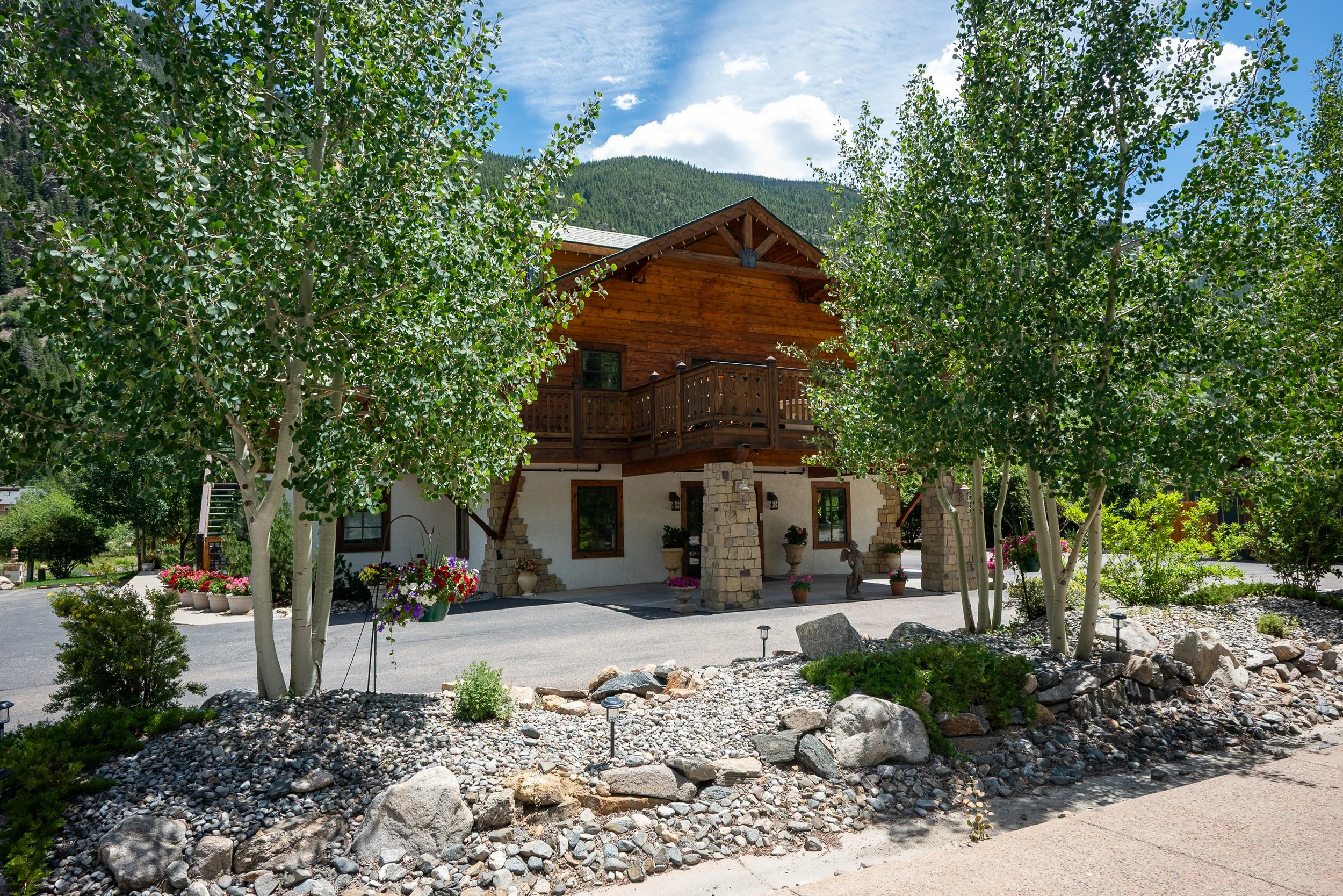 A large two-story lodge with wooden accents and a stone foundation, surrounded by potted plants and flowers, with mountains in the background. There is a sign that reads 'Serenity for Life' near the entrance, and a spacious asphalt parking area.