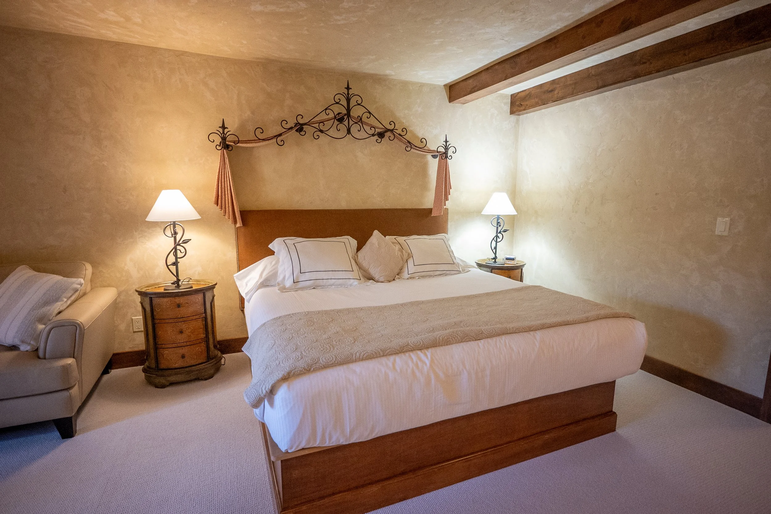 A neatly made bed with white linens, three pillows, and a decorative beige bedspread beneath a brown wooden headboard, with two bedside tables with lamps, in a warmly lit bedroom with beige walls and dark wood beams on the ceiling.