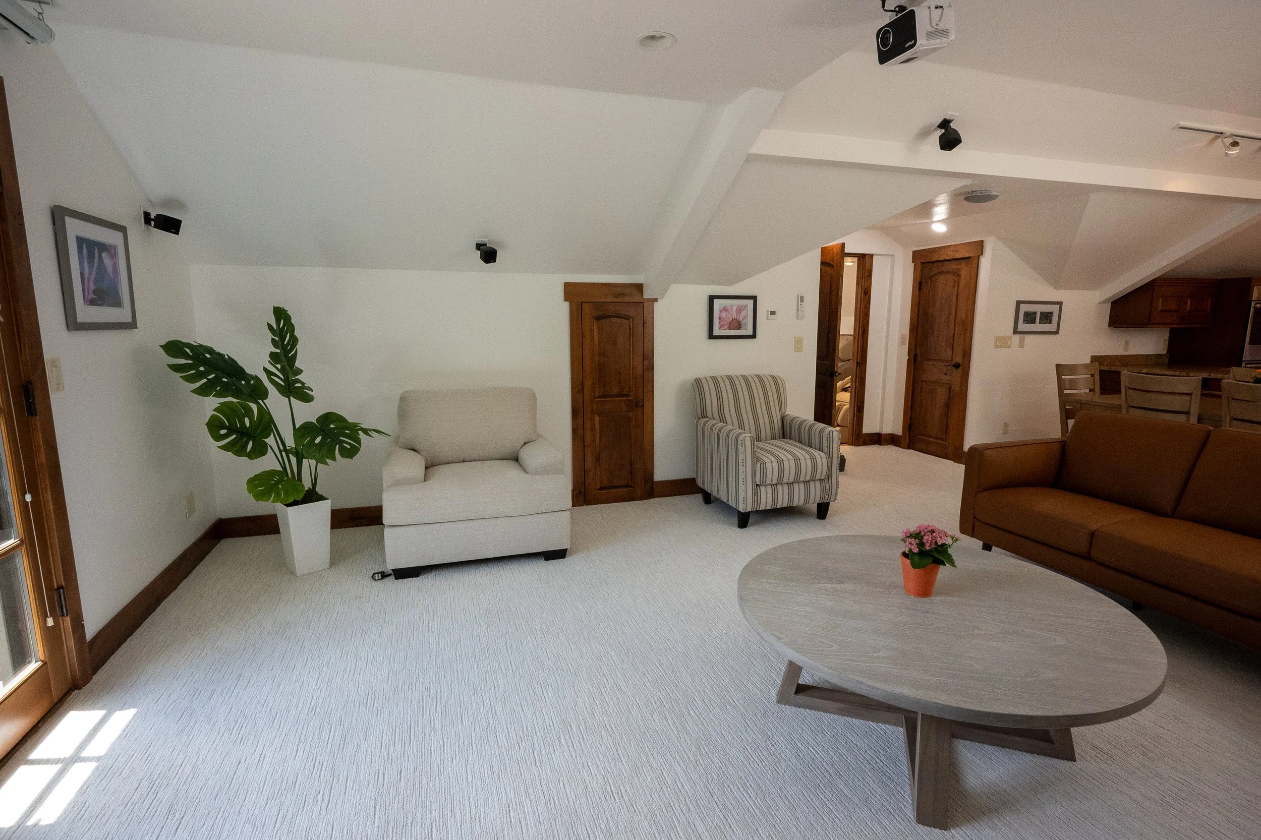 Living room with white walls, ceiling-mounted projector, two cream-colored armchairs, one striped armchair, a wooden coffee table with a pink flower pot, large plant in white pot, brown sofa, dining area with wooden chairs, doorways, framed pictures, wooden trim.