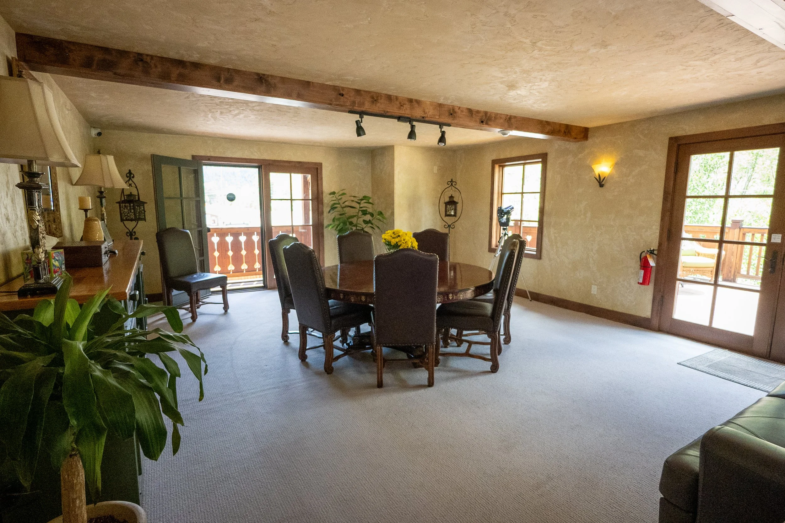 A dining room with a round wooden table, six black upholstered chairs, and a centerpiece of yellow flowers. The room has beige walls, large windows, and two glass doors leading to a balcony. There are plants, lamps, and wall sconces, with wooden beams on the ceiling and carpeted floors.