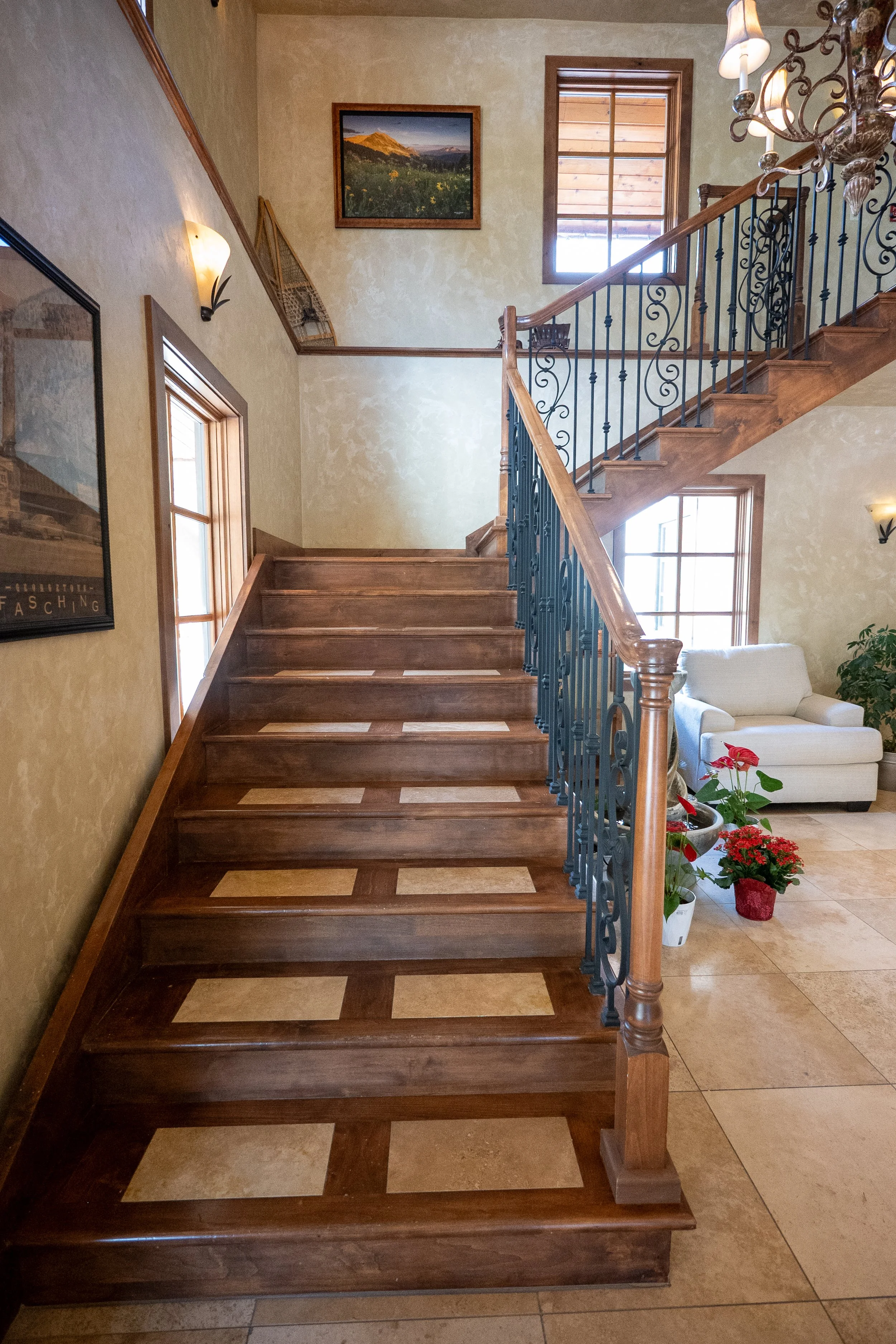 Interior view of a home with a wooden staircase leading to an upper level, beige walls, and windows letting in natural light. There are framed pictures on the walls, a chandelier hanging from the ceiling, and potted plants near a white sofa.