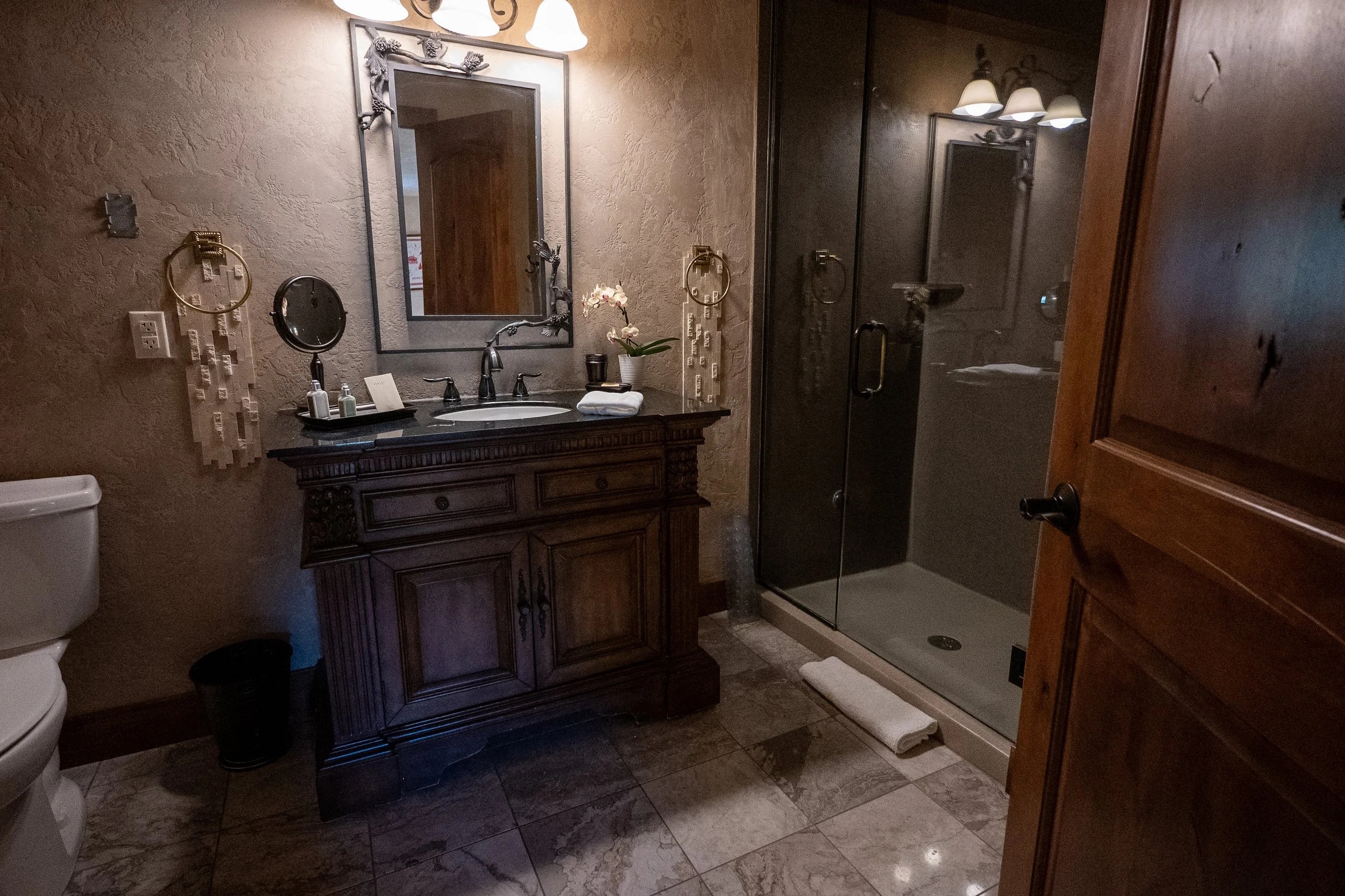 A bathroom with a wooden vanity, a framed mirror, and a flower arrangement. There is a glass-enclosed shower with a towel on the floor in front of it. The walls are textured and there is decorative wall art.