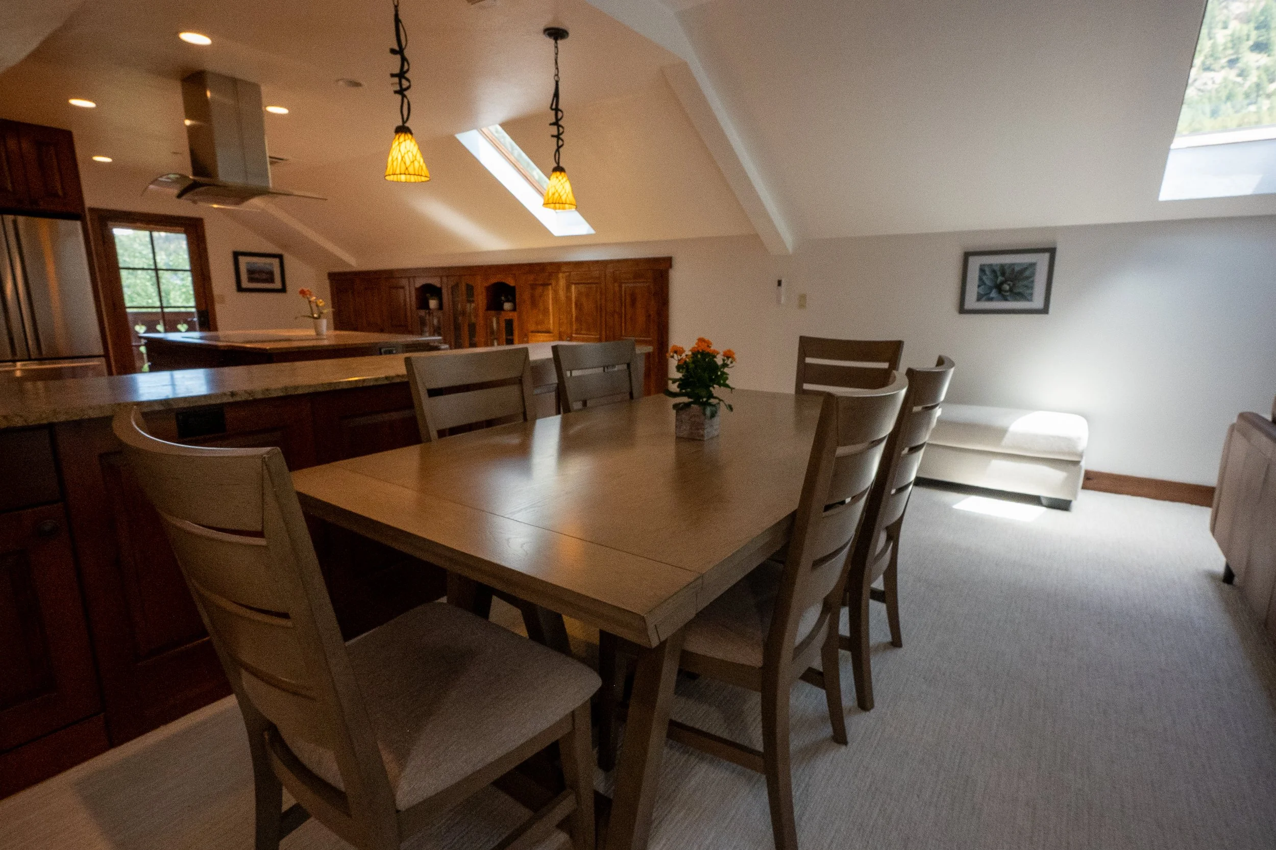 Dining room with a wooden table and six chairs, a flowerpot with orange flowers, two pendant lights, skylights, and a framed picture on the wall.