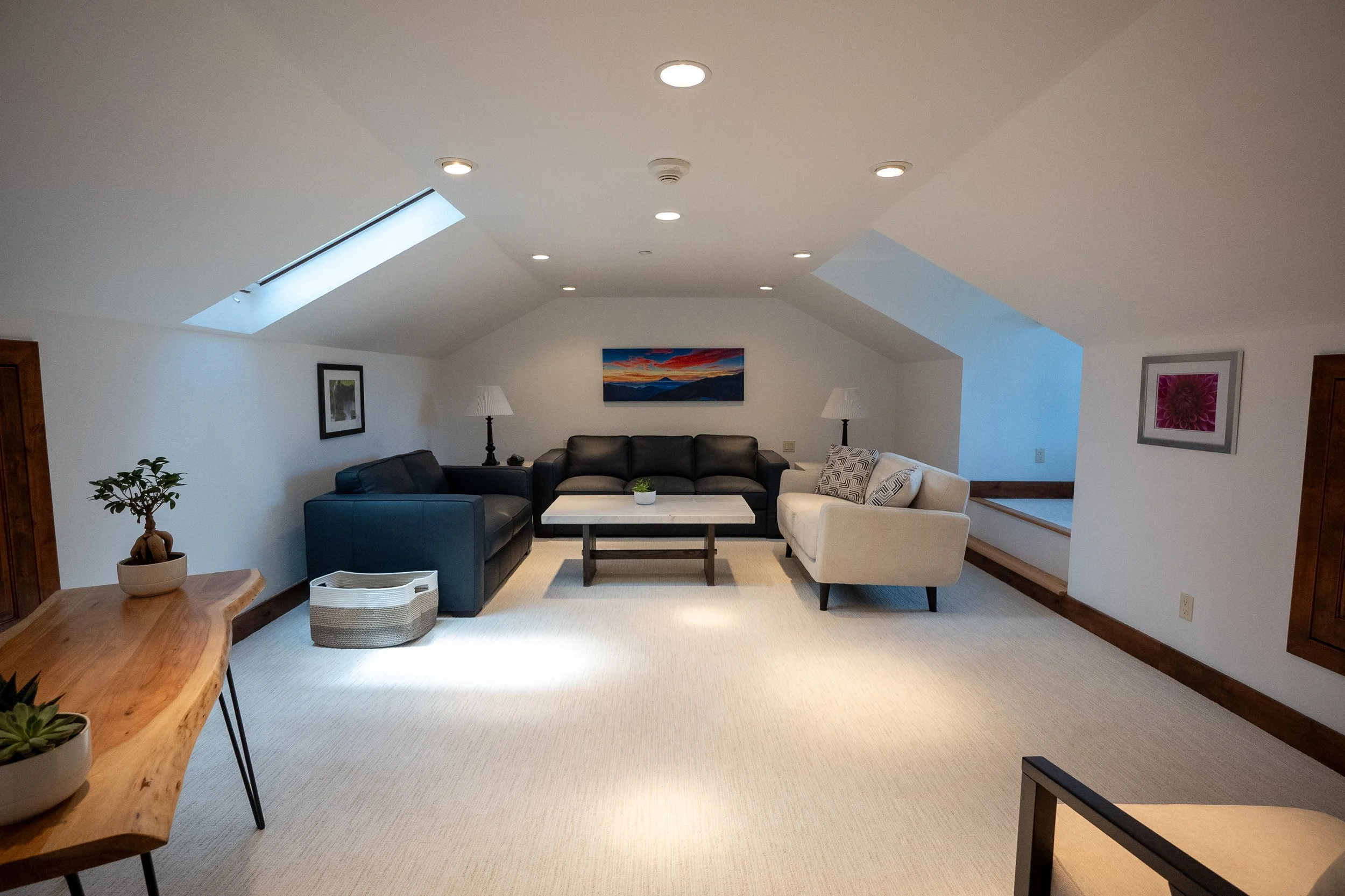 Living room with a skylight, two black sofas, a white coffee table with a small potted plant, a side table with a lamp, picture frames on the wall, and a painting of a sunset over mountains.