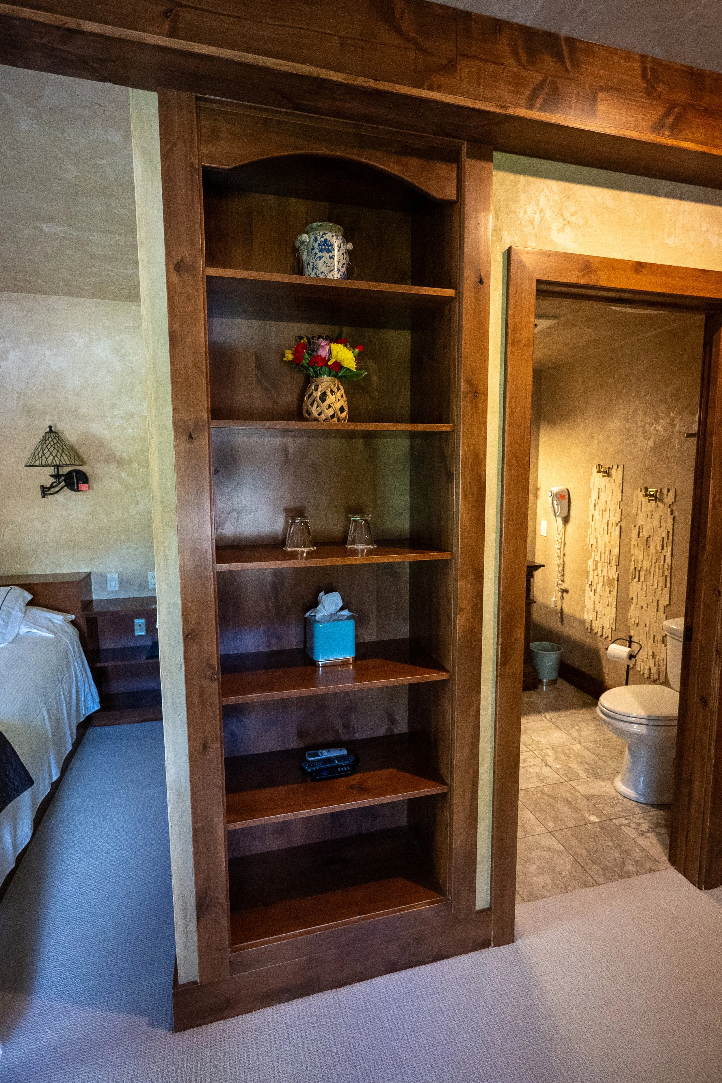 Wooden bookshelf in a room with decorative items, glasses, tissue box, and remote control, with a bathroom visible in the background.