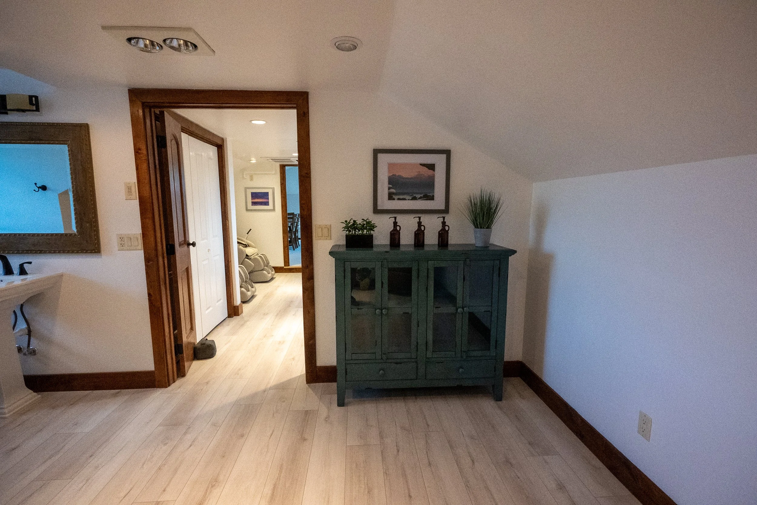 Interior view of a room with a green cabinet, framed wall art, potted plants, and a doorway leading to a hallway with a beige sofa.