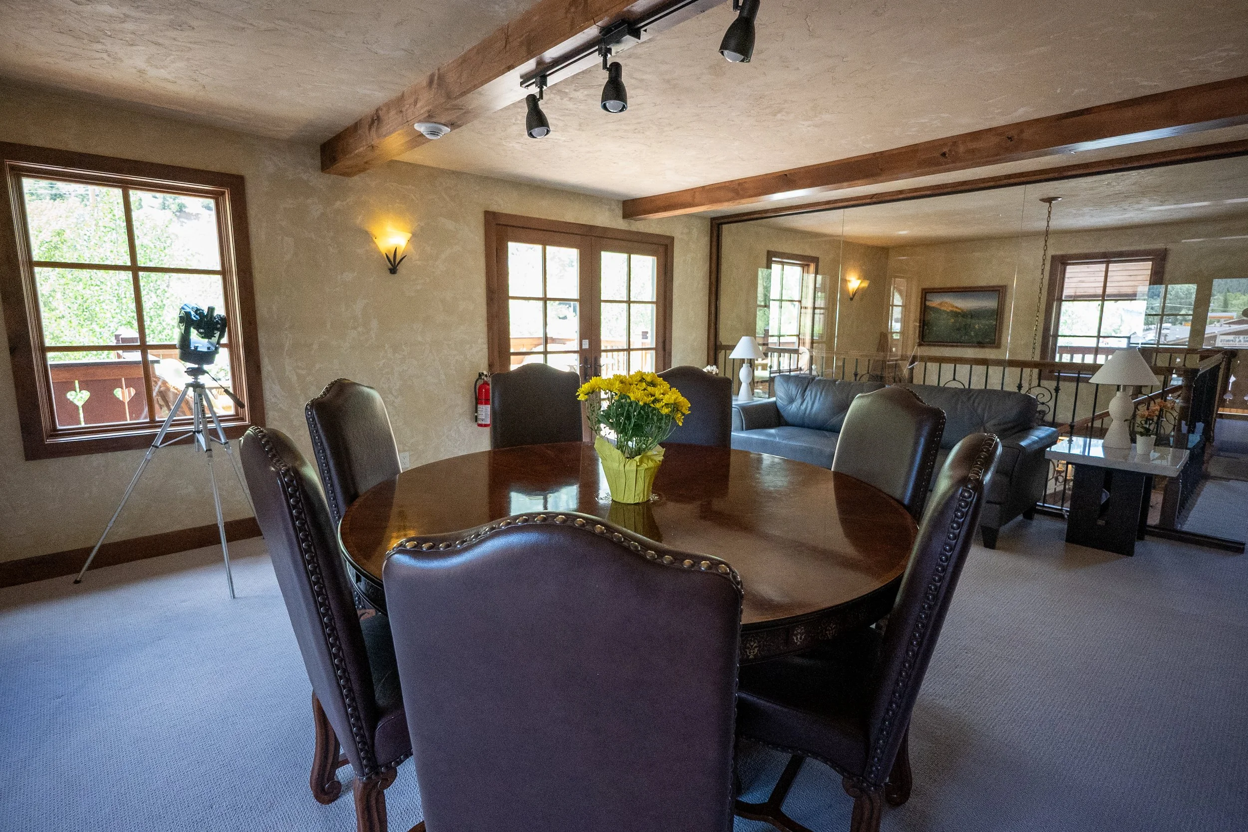 Interior of a room with a round wooden dining table with six leather chairs, a vase with yellow flowers, a telescope near a window, a wall-mounted fire extinguisher, and auxiliary seating and lighting in the background.