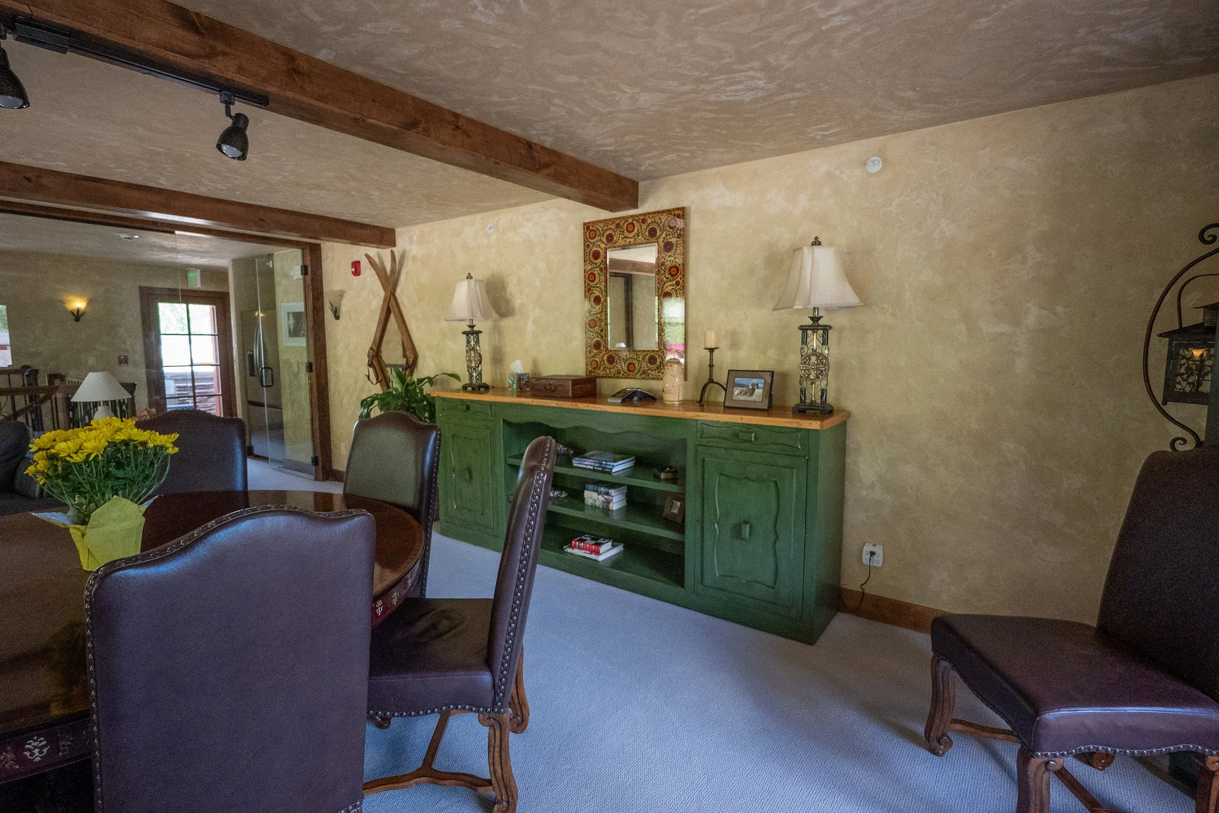 Living room with yellow textured walls, wooden ceiling beams, a green sideboard with decorative items, a mirror, and table lamps, dining table with a vase of yellow flowers, and dark leather chairs.