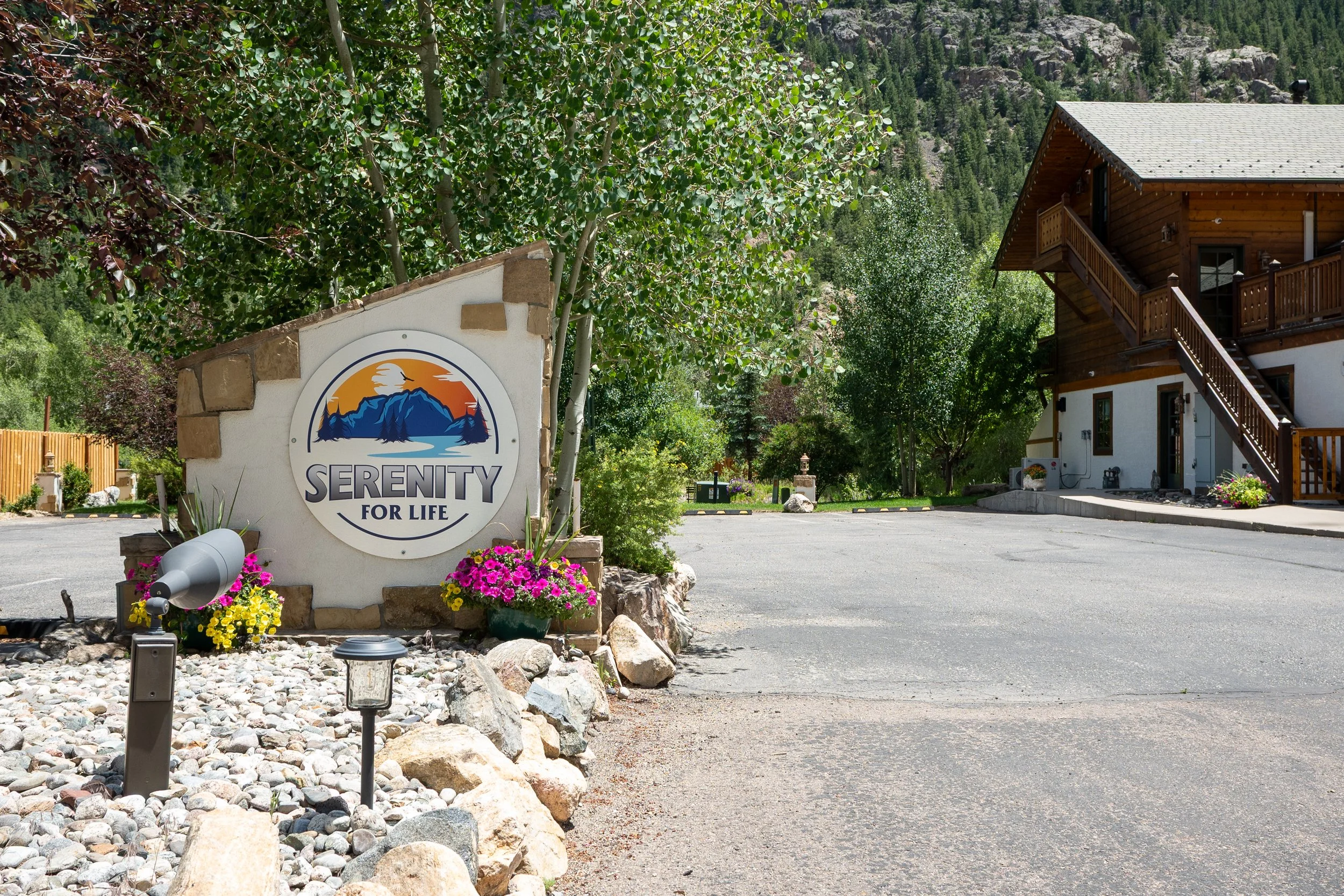 A sign that reads "Serenity for Life" next to a parking lot and a multi-story wooden building surrounded by trees and mountains in the background.
