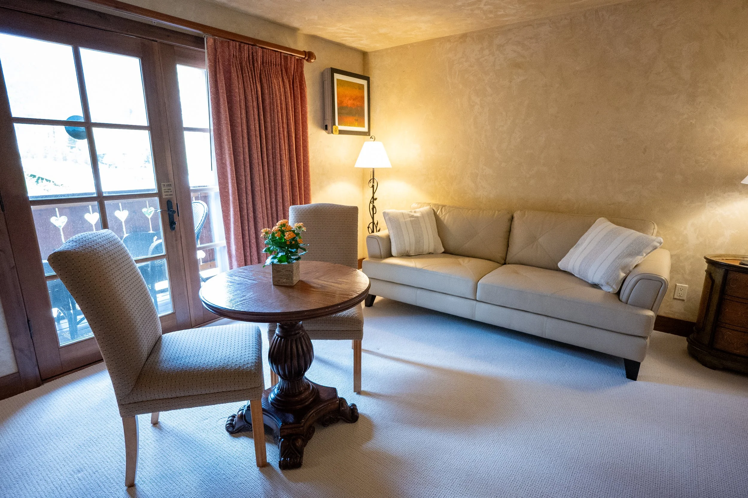 A cozy hotel room with a small seating area, a wooden cabinet with table lamps, a wall-mounted TV, a mini refrigerator, a coffee maker, and a round table with two chairs near sliding glass doors with curtains.