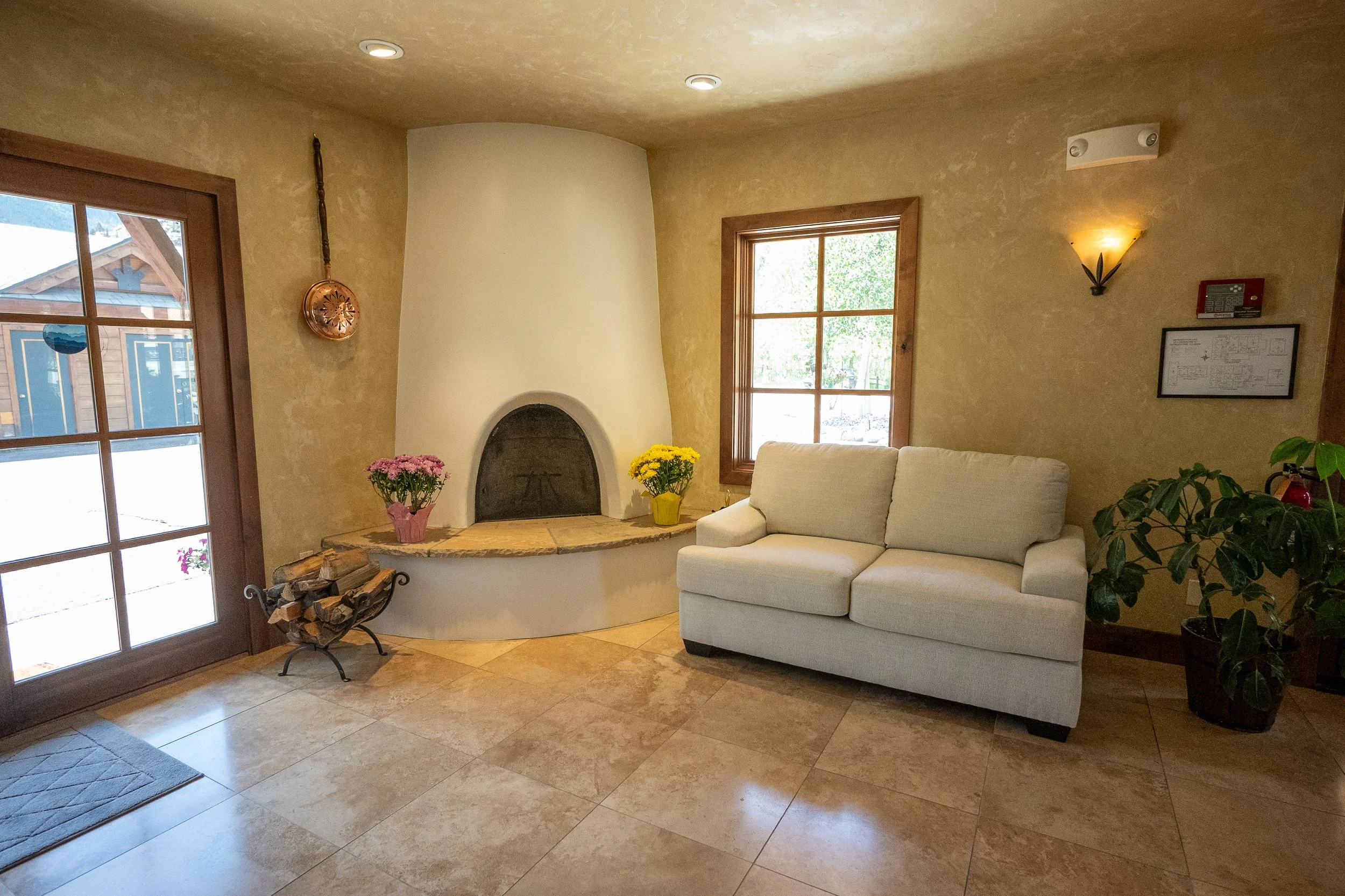 Lobby with wooden table, plants, couches, fireplace, and large windows.