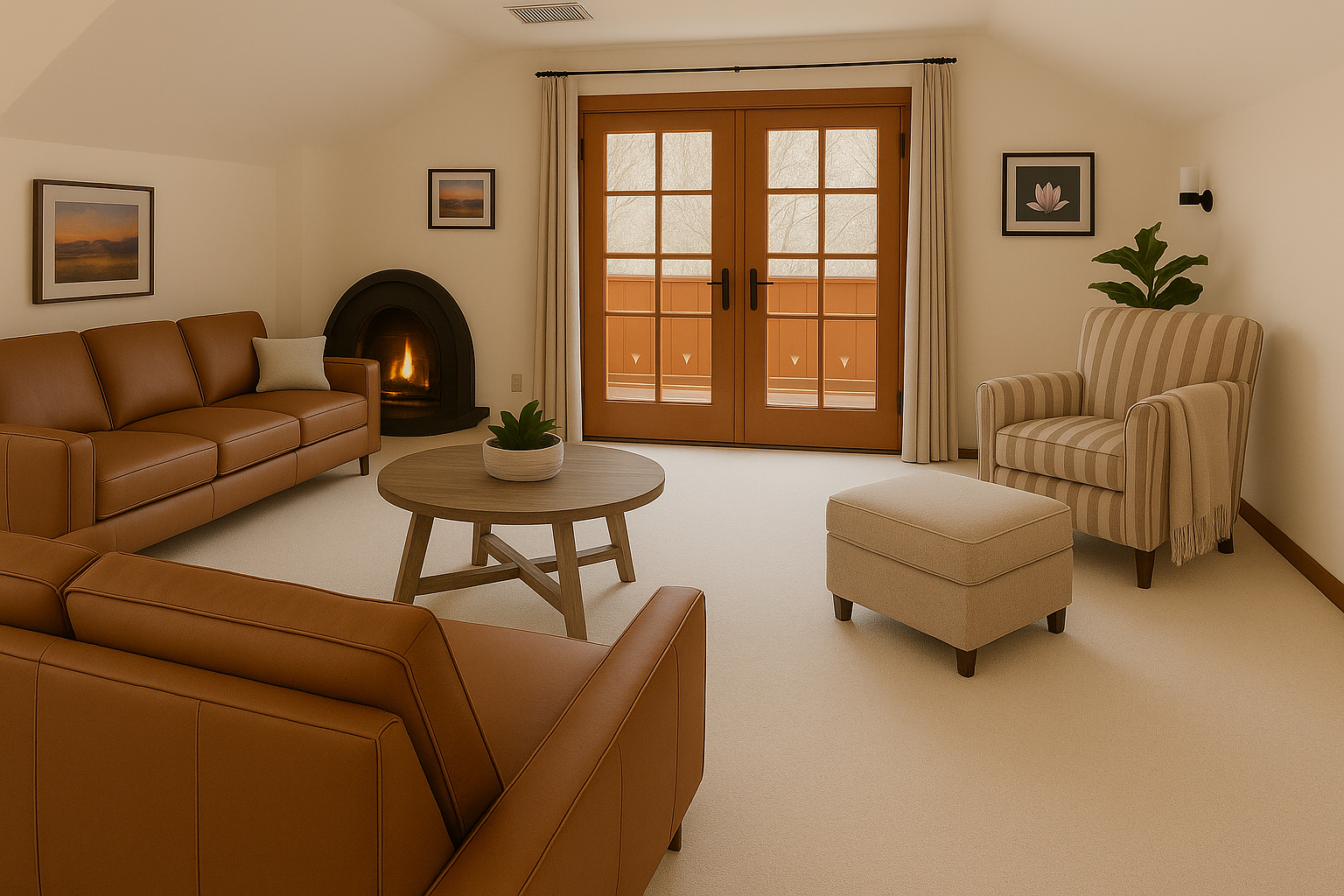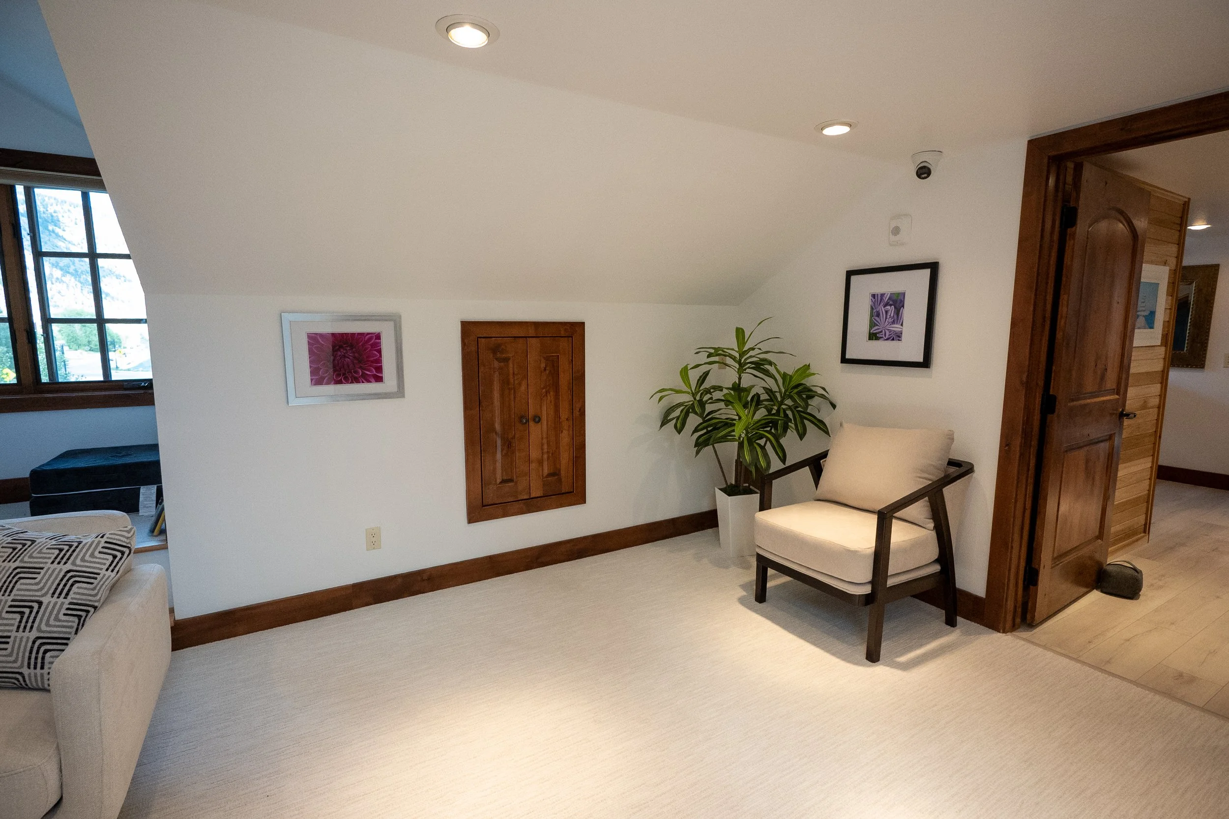 A cozy room corner with white walls, a beige carpet, and wood trim. There is a potted plant, a beige armchair with dark wooden arms and legs, and framed artwork on the walls. A window with multiple panes and a dark frame allows natural light in. The door to an adjacent room is partially open, revealing wooden accents.