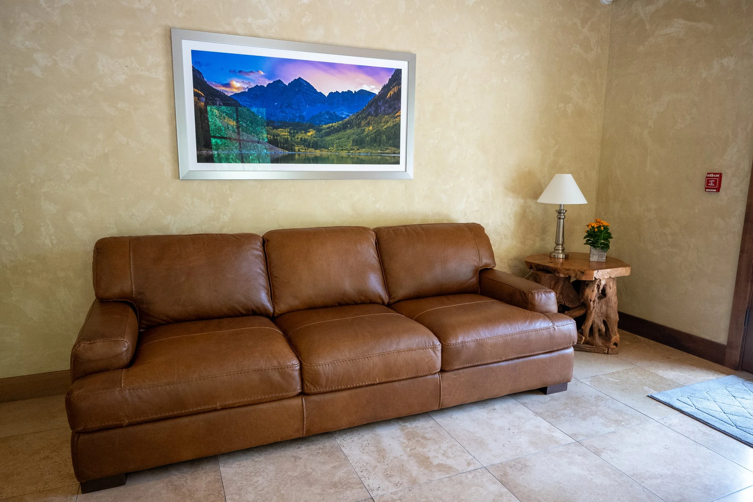 Living room with a brown leather sofa, a side table with a lamp and a potted plant, a painting of a mountain landscape on the wall, tiled floor, and a blue rug near the door.