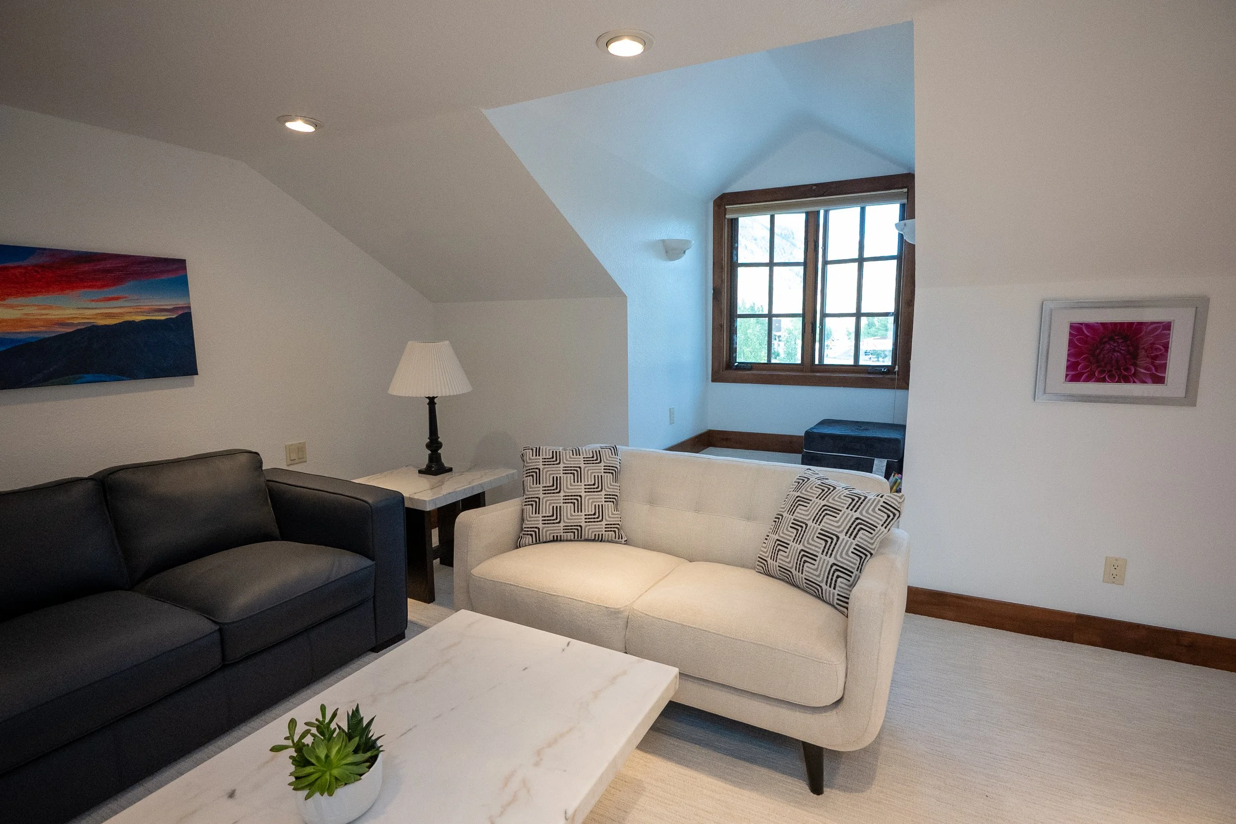 Living room with black and beige sofas, a white coffee table, a marble side table with a lamp, a window with wooden trim, and wall art, in a bright attic space.