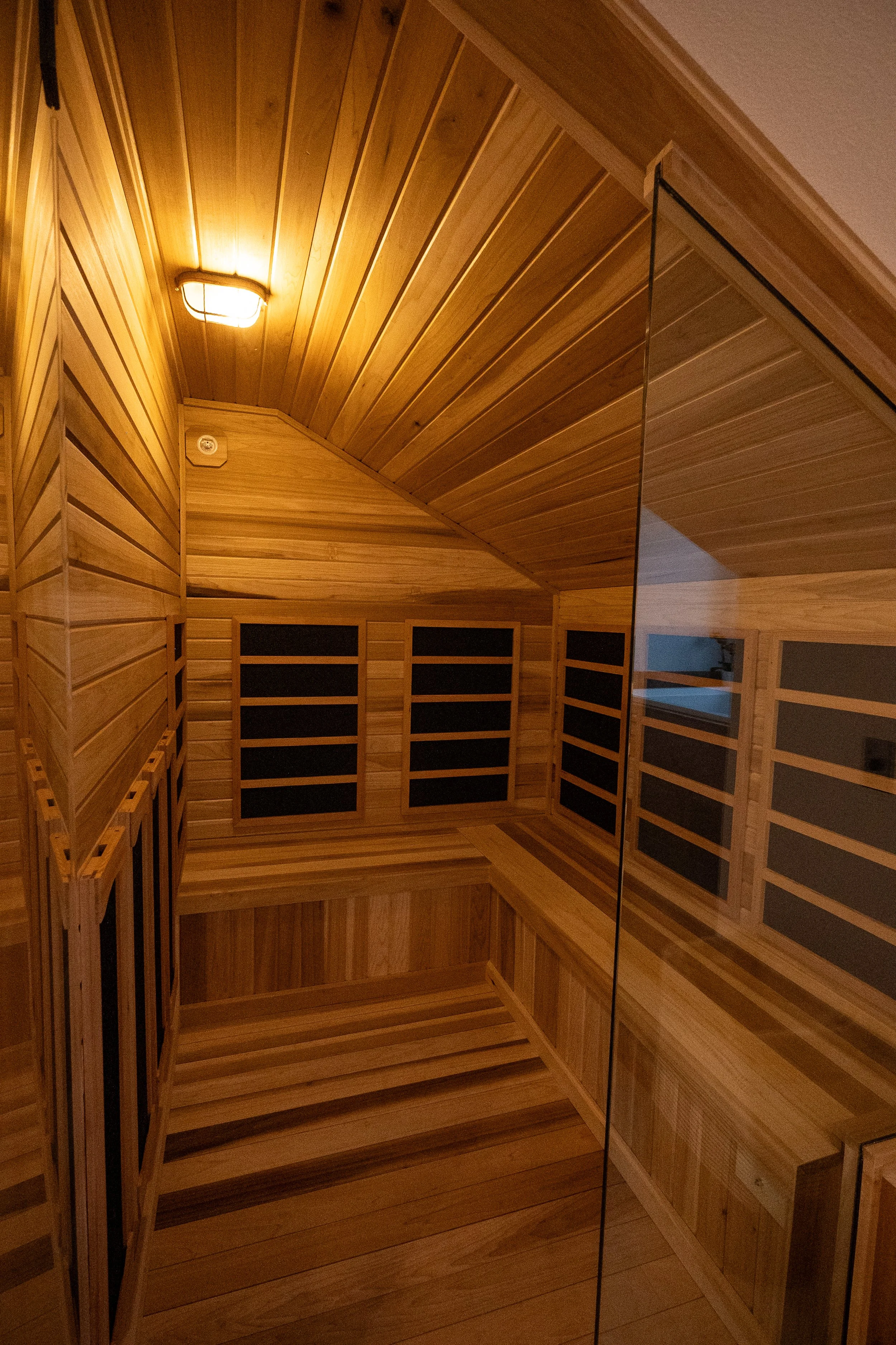 A wooden sauna with benches and a ladder, illuminated by a ceiling light.