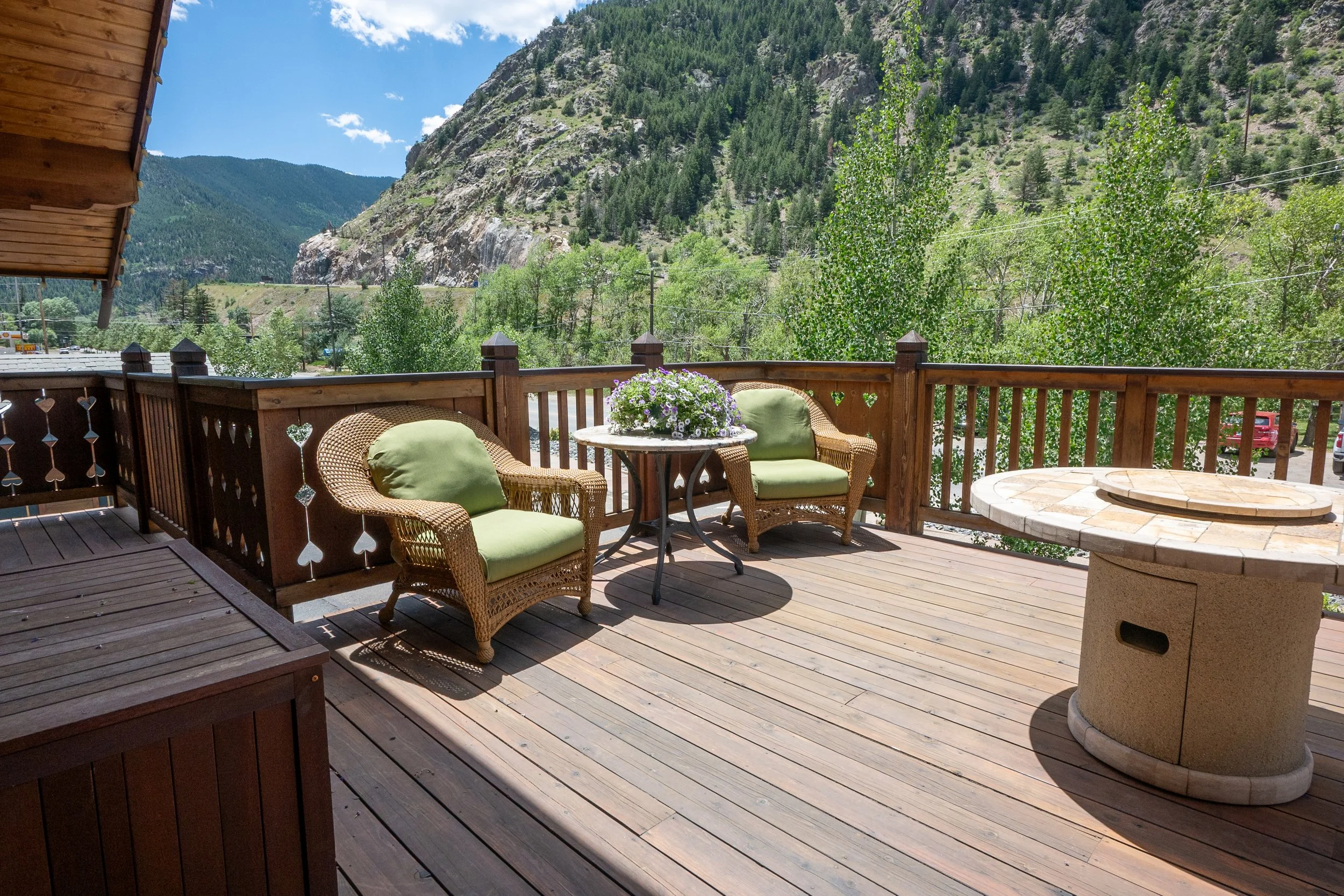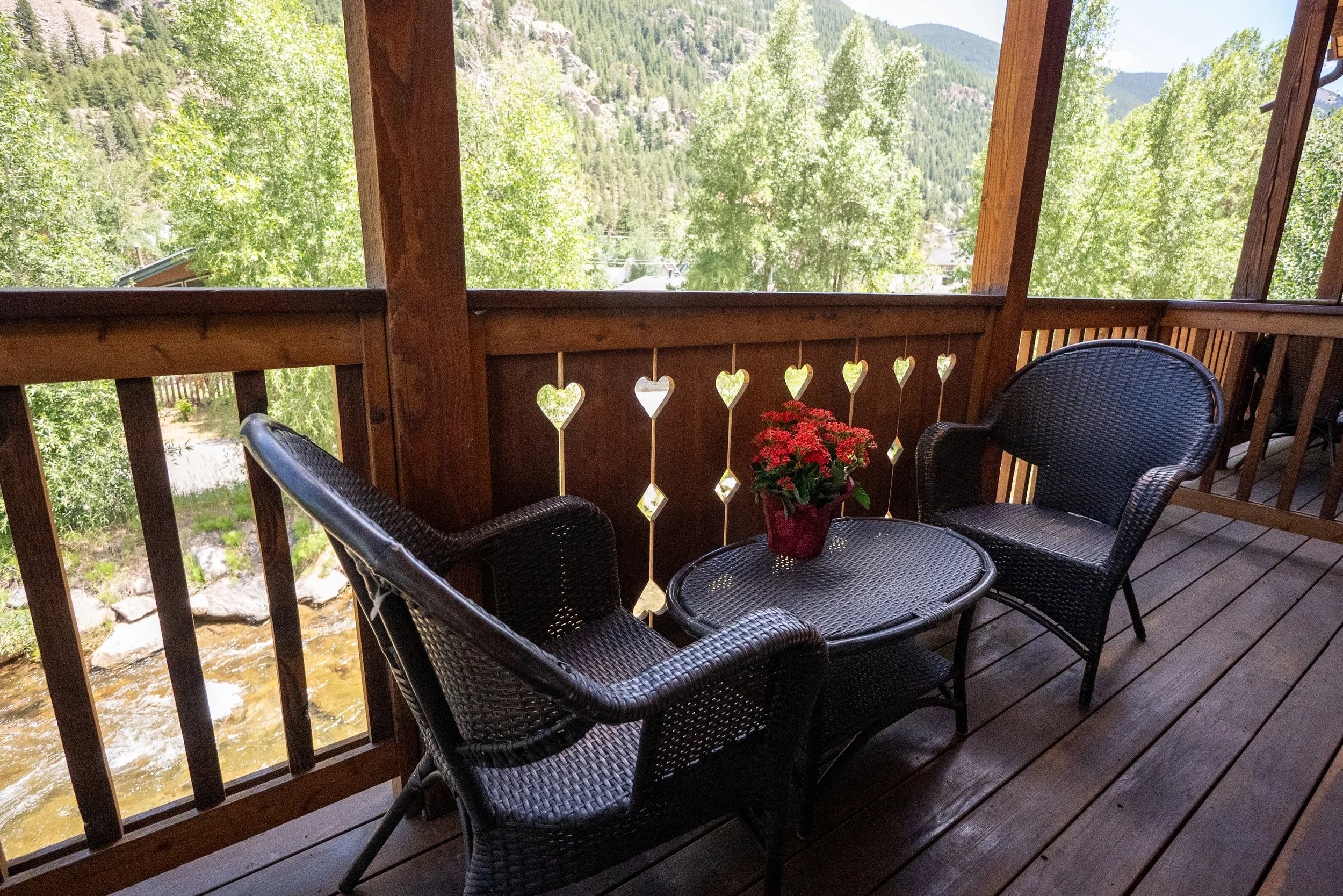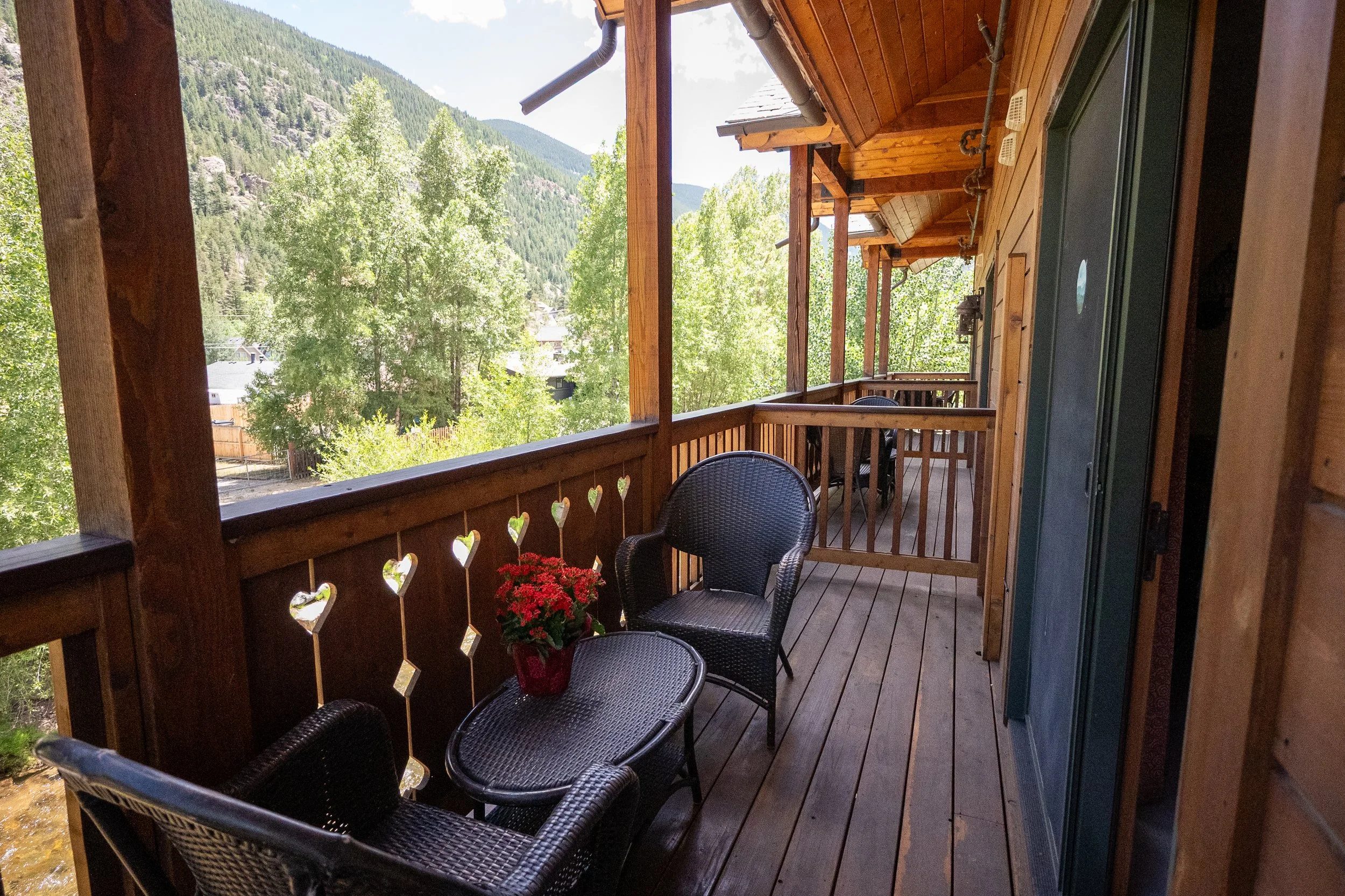 A small outdoor balcony with a black wicker table, chairs, and a potted plant, surrounded by wooden railings with heart cutouts. In the background, there are neighboring wooden houses, lush green trees, and mountain scenery.