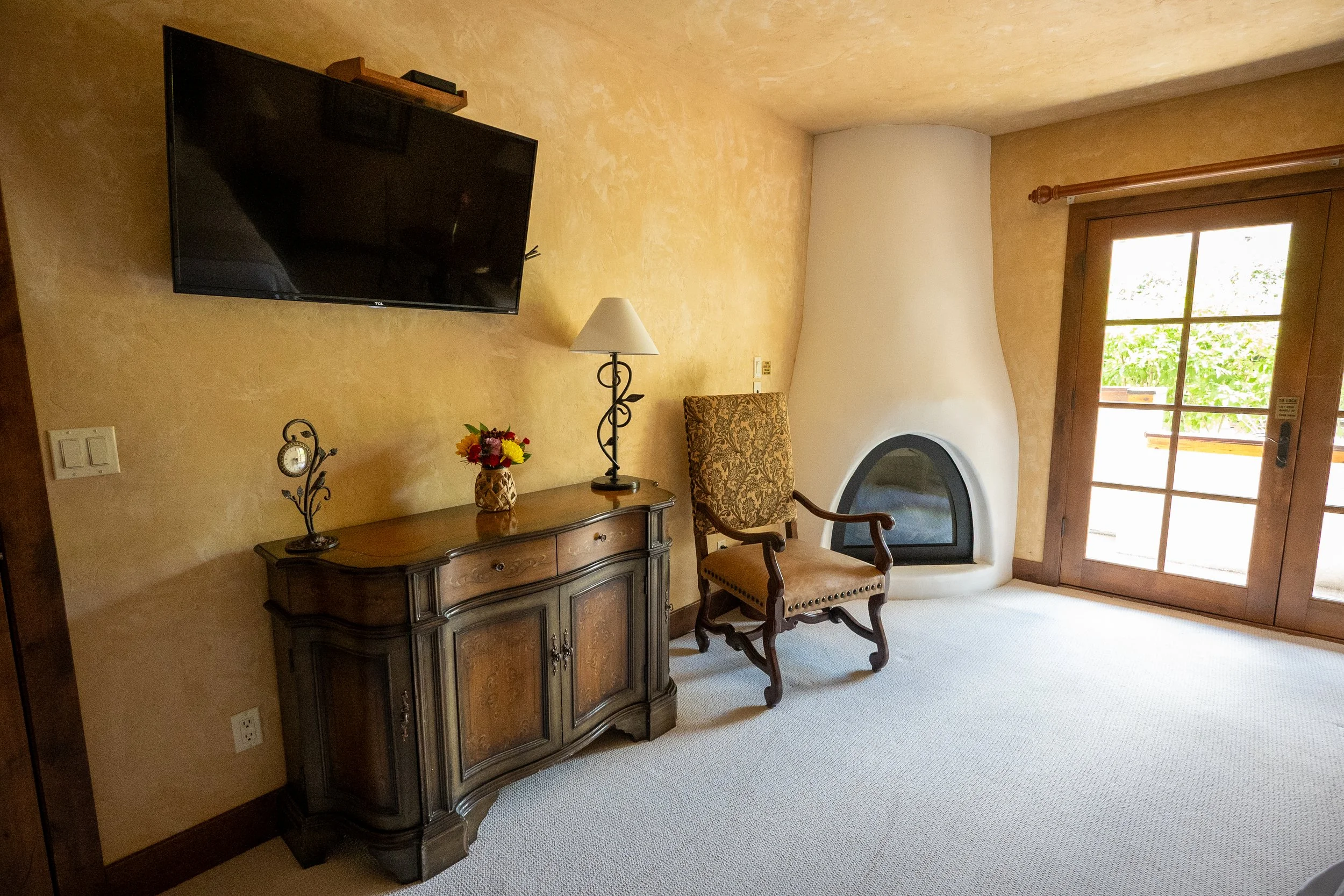 A living room corner with a wall-mounted flat screen TV, a wooden sideboard with a small floral arrangement, a table lamp, an upholstered armchair, a white plaster fireplace, and a wooden sliding glass door leading outside.