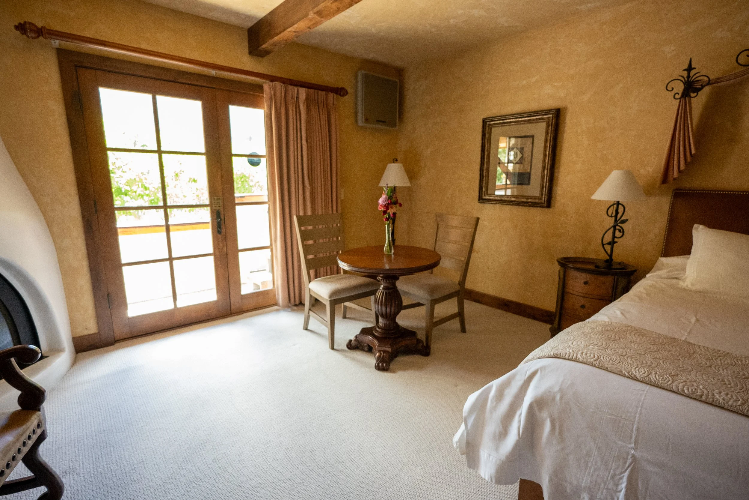 Hotel room with a bed, wooden side table with lamp, small round table with a vase of flowers, two chairs, glass door leading to a balcony, and window curtains.