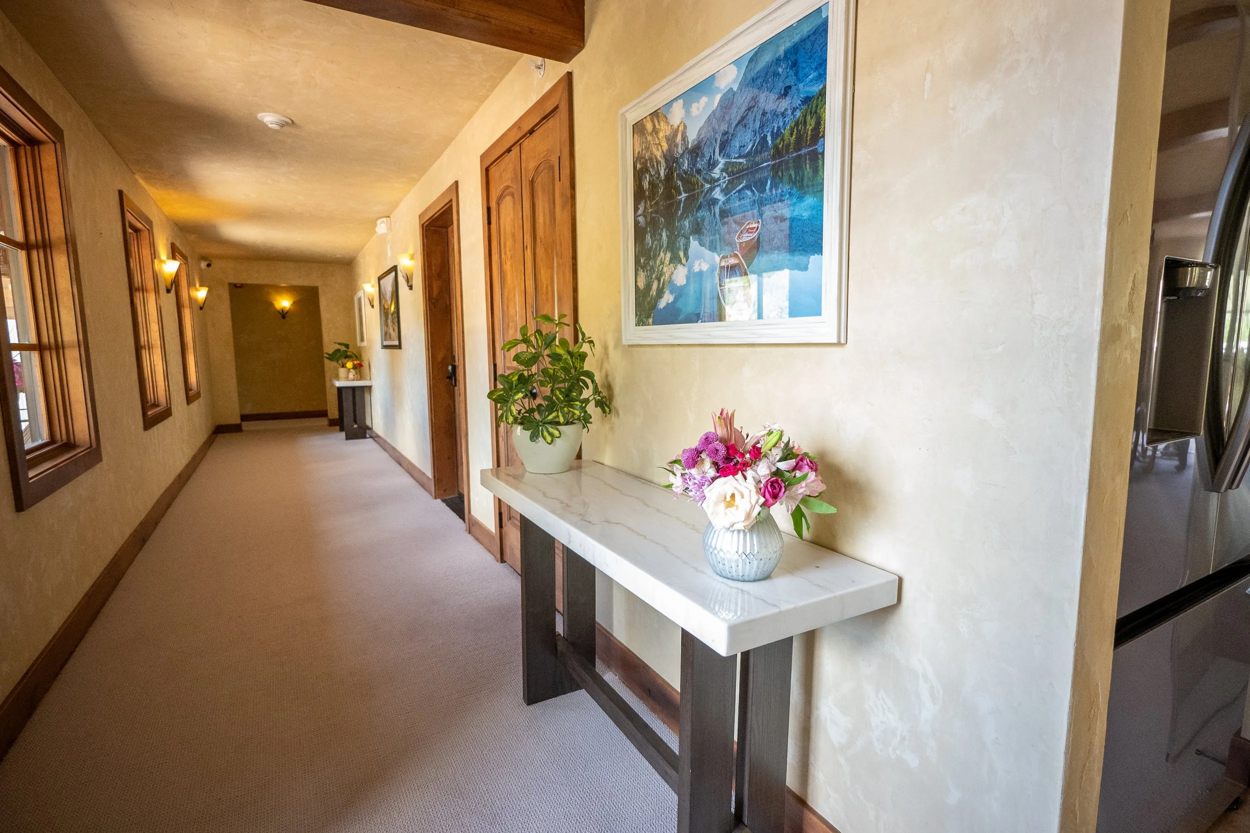 A hallway with beige walls, decorated with framed landscape paintings and wall sconces, featuring a console table with a large potted plant and a smaller vase of flowers, leading to a window at the end.