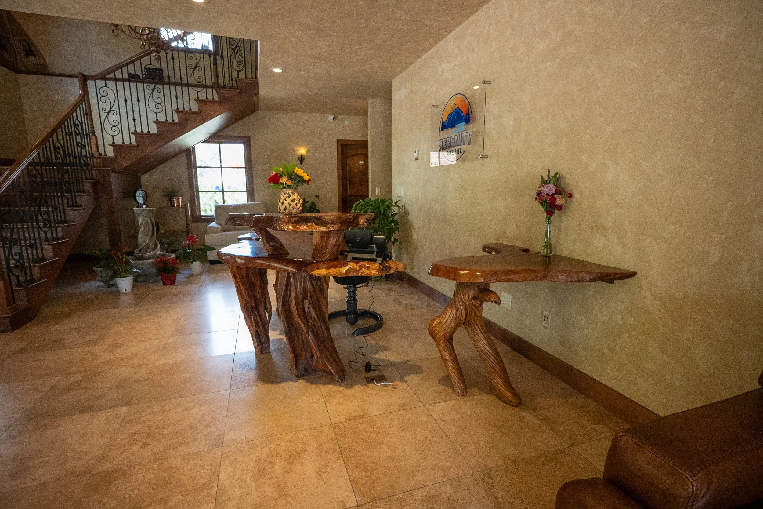 Interior of a house with wooden staircase, potted plants, a white armchair, and decorative fountain in the corner.