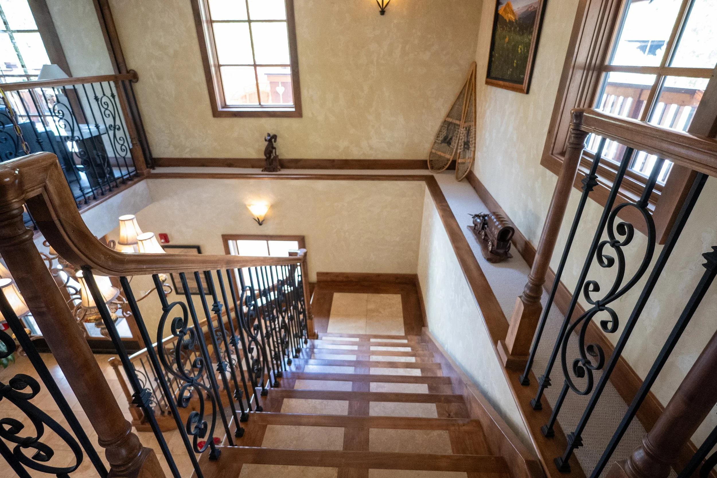 View of a staircase and landing area in a house with wooden accents, black wrought iron railings, large windows, lamps, and decorative items on the walls and shelves.