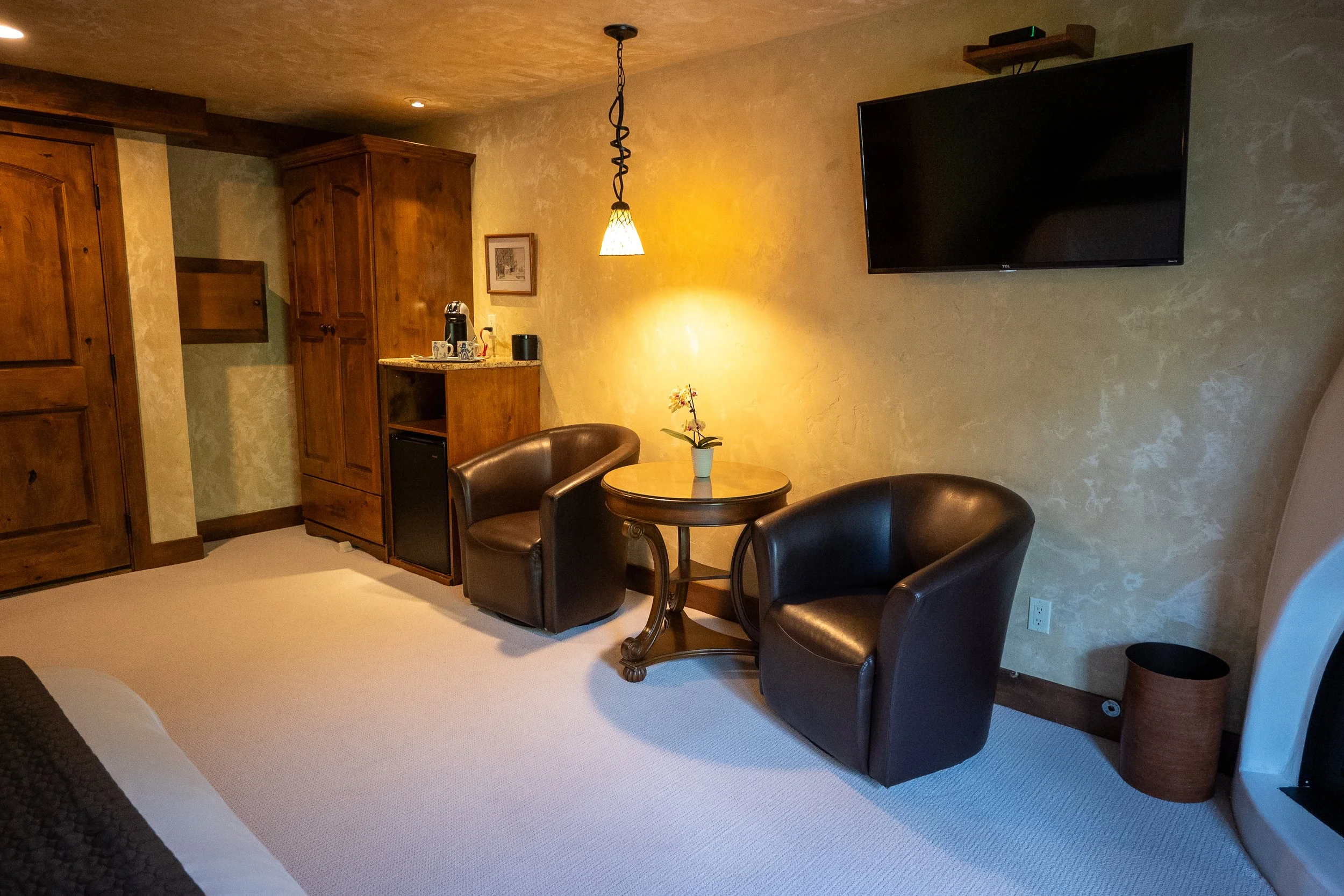 A living room corner with two black leather armchairs, a small round wooden table with a flower pot, a wall-mounted flat-screen TV, wooden cabinets, a hanging light fixture, and a beige carpet.