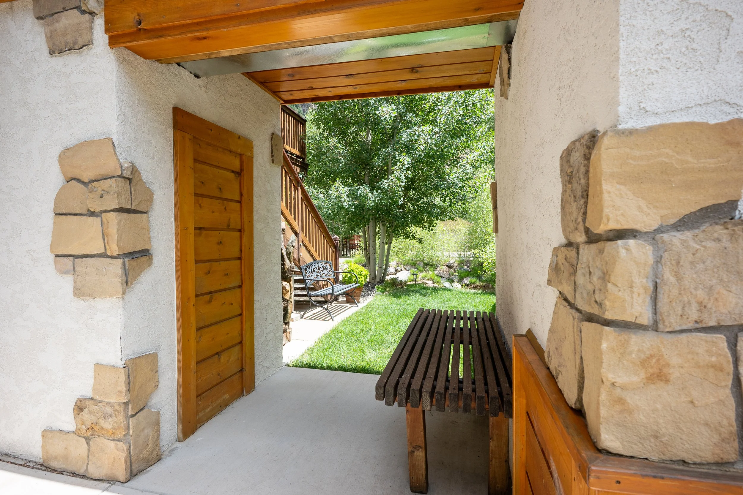 View of a cozy backyard garden with green grass, trees, stone and wood features, a bench, and a hanging chair, seen from a covered patio area with stone and wood accents.