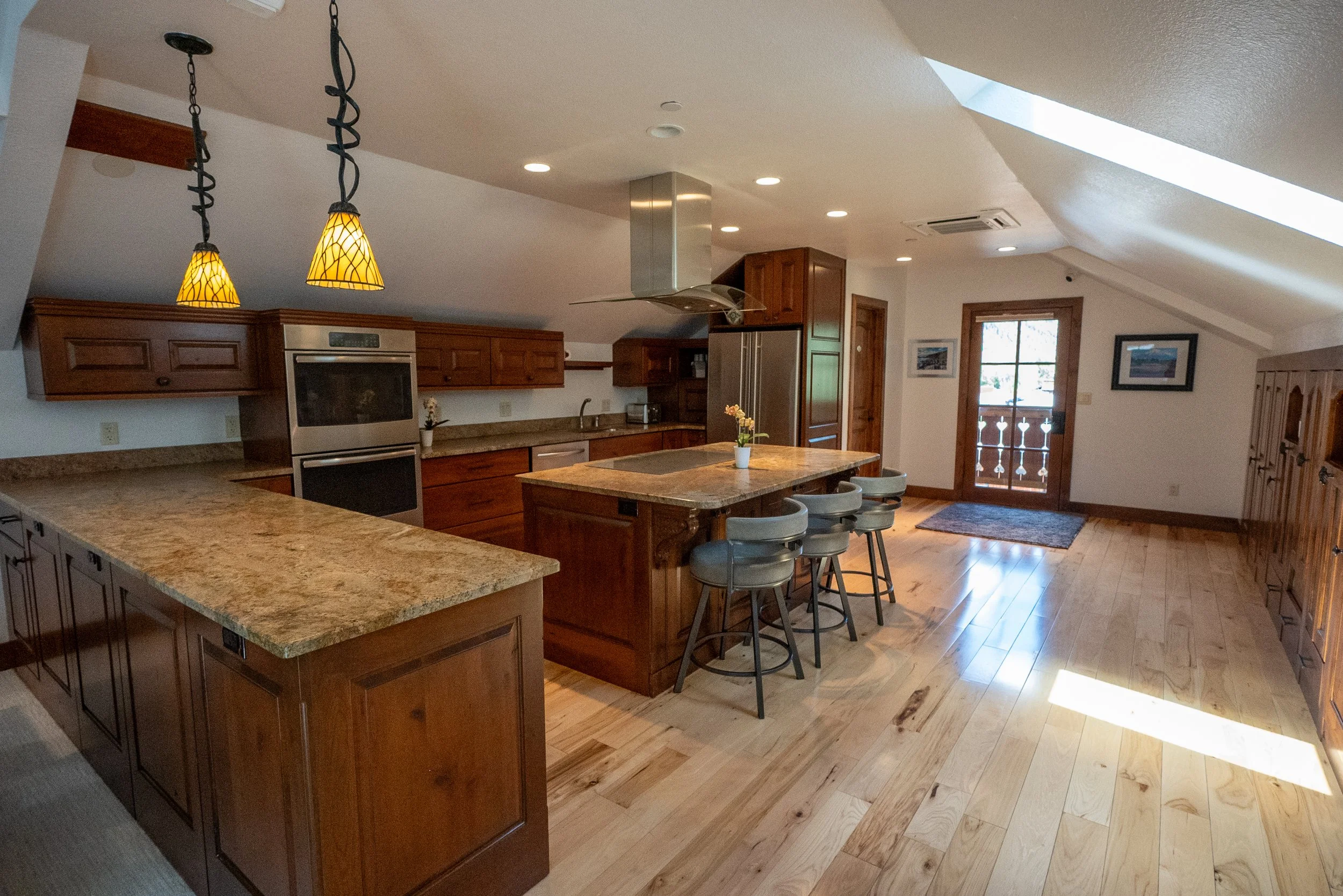 Kitchen with wooden cabinets, a granite island with an electric cooktop, stainless steel refrigerator, skylight, and a door leading outside.
